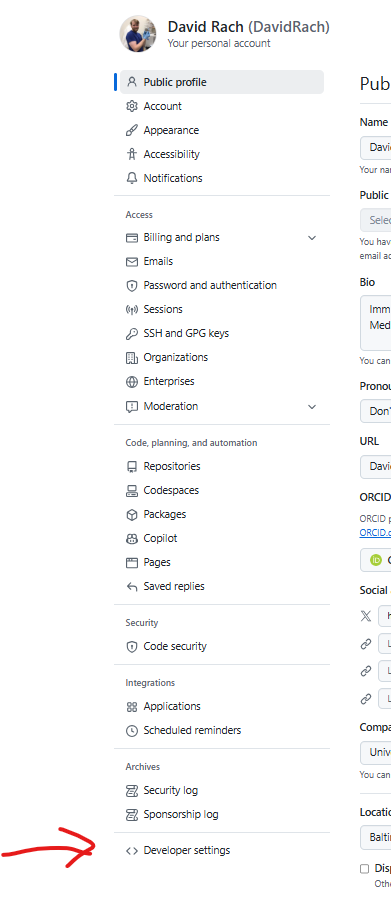 With this done, it is now time to get a GitHub Token that will be used for authorization for your local computer to send/receive files from your GitHub repository.